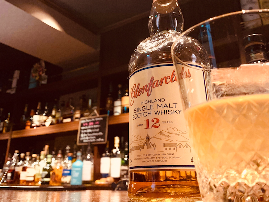 お選びしたのは、スペイサイドのシングルモルト、シェリー樽熟成が特徴の "グレンファークラス12年" 甘い香りが広がる飲みやすいウイスキーです。ロックでご提供したのは氷が溶けていく味の変化も楽しんで頂きたいから。