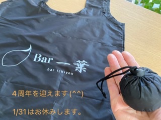 こんにちは。週末いかがお過ごしですか。明後日2/1、Bar一葉は4周年を迎えます。山越え谷越えどっこいしょ。皆様のあたたかいご支援でここまで来る事ができました。ありがとうございます😊 今年こそはまた「おでん一葉」でお迎えしたかったのですが、今年もコロナ、あーーー哀しい😭 「おでん一葉」は様子を見て後日やりたいなあと思っています。2/1からはイベントは行いませんが、ささやかなプレゼントをご用意しています。ちっちゃくなるエコバッグ!カバンにポン、便利ですよ。ご都合の良い時にお立ち寄りくださいませ❣️ 今週もまん延防止等重点措置のため、営業時間 18時から21時、お酒のご提供は20時までとなります(日曜定休)尚、明日1/31は都合により臨時休業させていただきます🙇♀️
