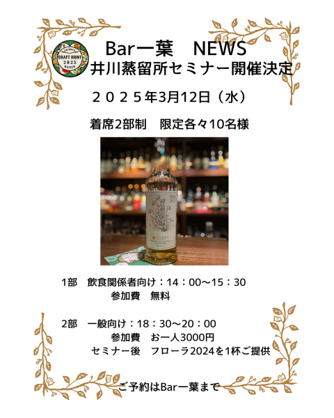 *YOTSUYA CRAFT HANT*井川蒸溜所セミナー開催日程!!3月12日(水) セミナースタイル着席・☆関係者向け. 開催14時 .参加費無料☆お客様向け. 開催18時30分.参加費 3,000時. セミナー後フローラ2024を1杯ご提供します🥃試飲は5種類!レアカスク、発売前のピーテッドモデルも試飲いただけます🥰席数限定、ご予約募集中です。DM、直接ご連絡くださいね。さてさて、今宵もお待ちしています🥃