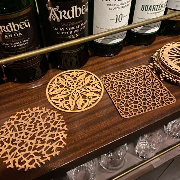 当店、こだわりの木製コースター。見に来てくださいね。今宵も皆様のお越しを心よりお待ちしております。